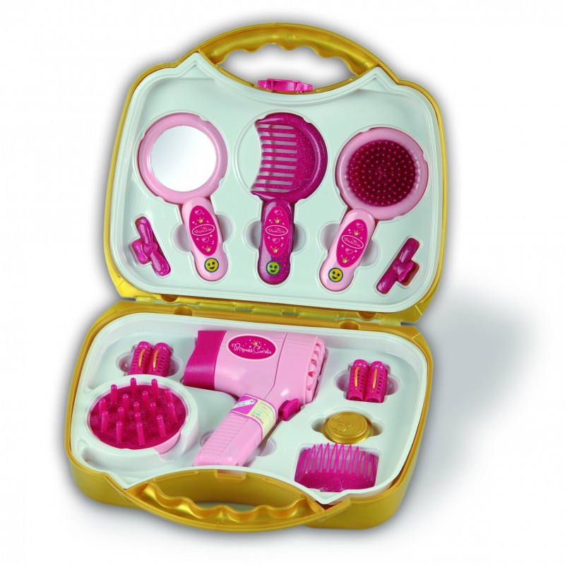 O secador com um difusor ligado funciona com baterias - depois de pressionar o botão, ele sopra com ar, sem aquecer. Uma escova de cabelo, pente e rolos de cabelo permitem que você estilize seu cabelo perfeitamente, e os ganchos de cabelo e os pentes decorativos irão ajudá-lo a estilizá-lo lindamente. Muita diversão garantida.