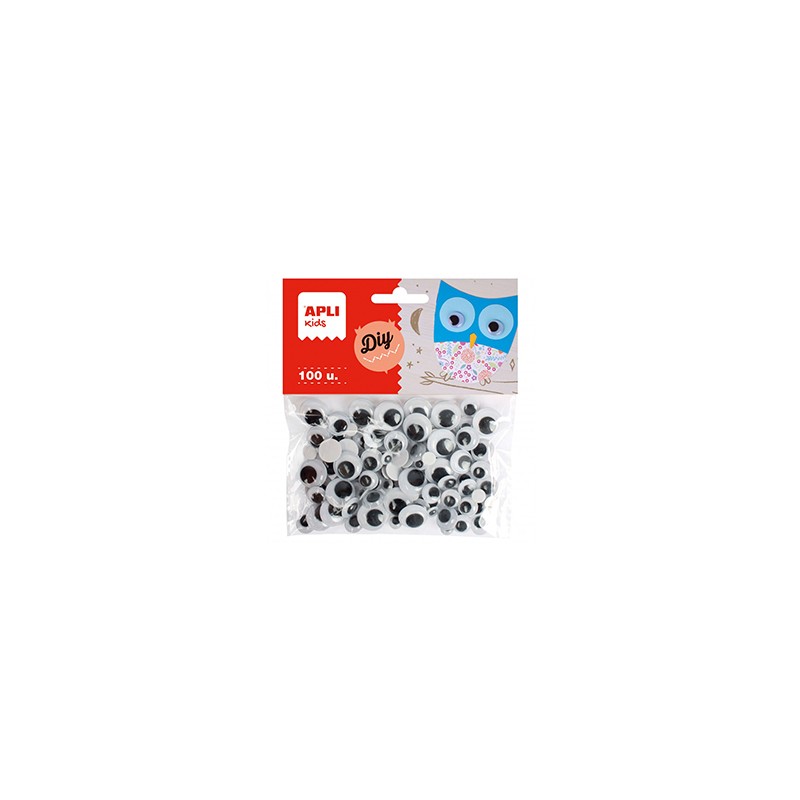 Olhos móveis com adesivo na parte de trás, prontos para usar. Forte poder adesivo em muitas superfícies: papel, papelão, espuma EVA, plástico, cerâmica ou vidro. Produto básico para escolas e oficinas infantis, ideal para agregar em desenhos, fantoches ou em outros artesanatos.