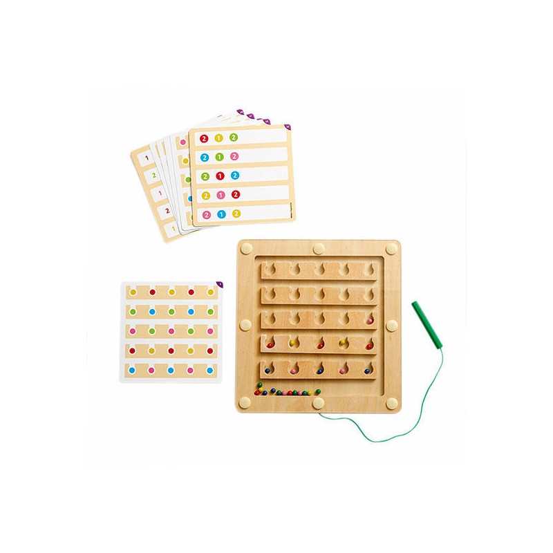 Um jogo de percurso magnético estimulante baseado na concentração e na paciência: cada bolinha no seu alvéolo! Com a ajuda do lápis magnético, a criança move as 25 bolinhas magnéticas uma por uma, de forma a reproduzir o modelo ou a responder às instruções da ficha. As 12 fichas frente e verso apresentam 24 atividades organizadas em 3 níveis de dificuldade.