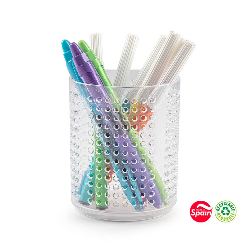 Porta lápis transparente que permite que o conteúdo esteja sempre visível sem ter que retirar nenhum artigo.
