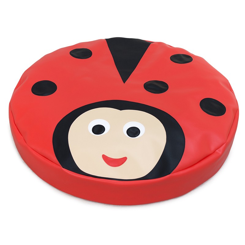 Almofadão gigante em forma de joaninha, fabricado em tela lavável e impermeável e interior em espuma triturada.
