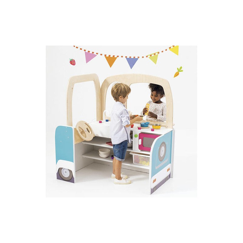 Uma área de recreação única com este colorido food truck que oferece uma área de cozinha e espaço no balcão. Este cantinho de brincadeiras original se encaixará facilmente em sua sala de aula!