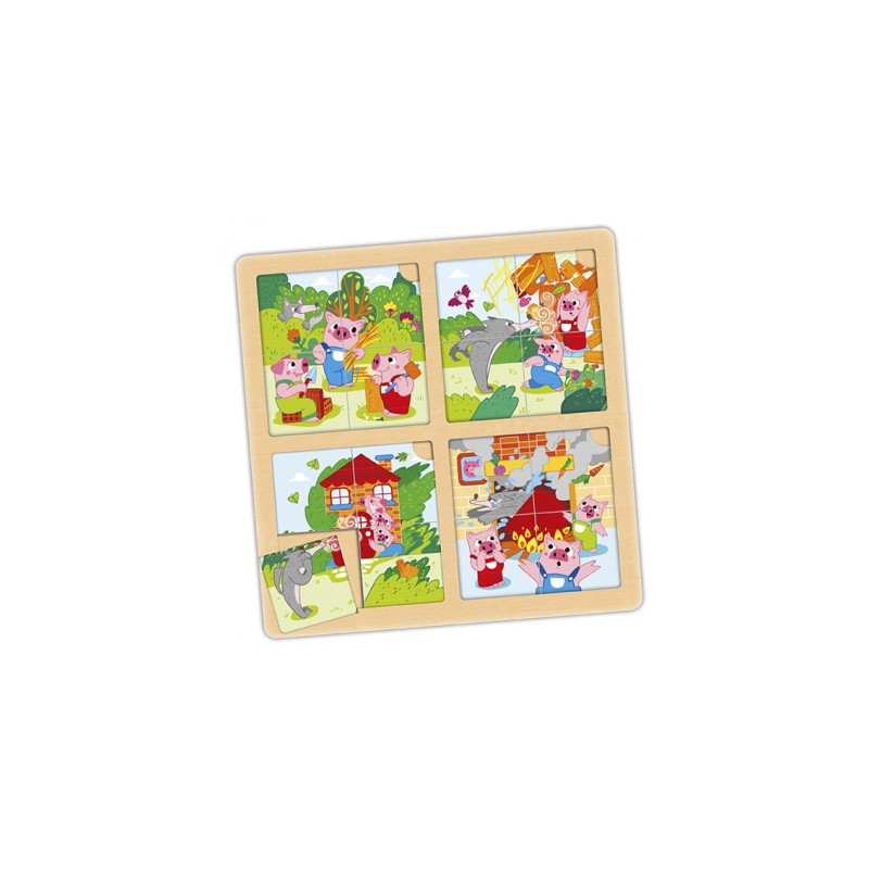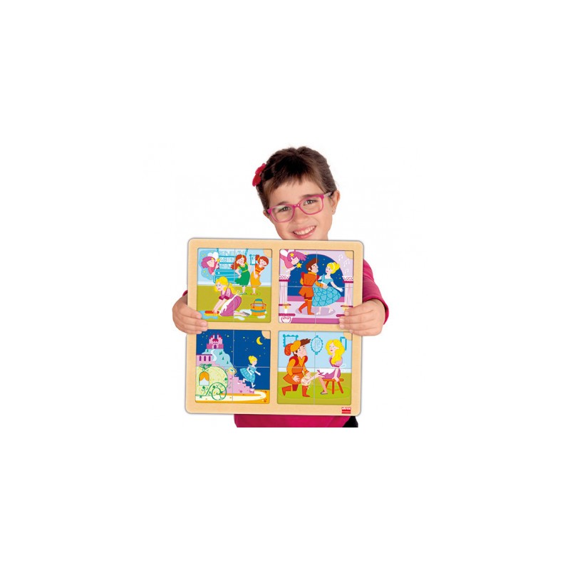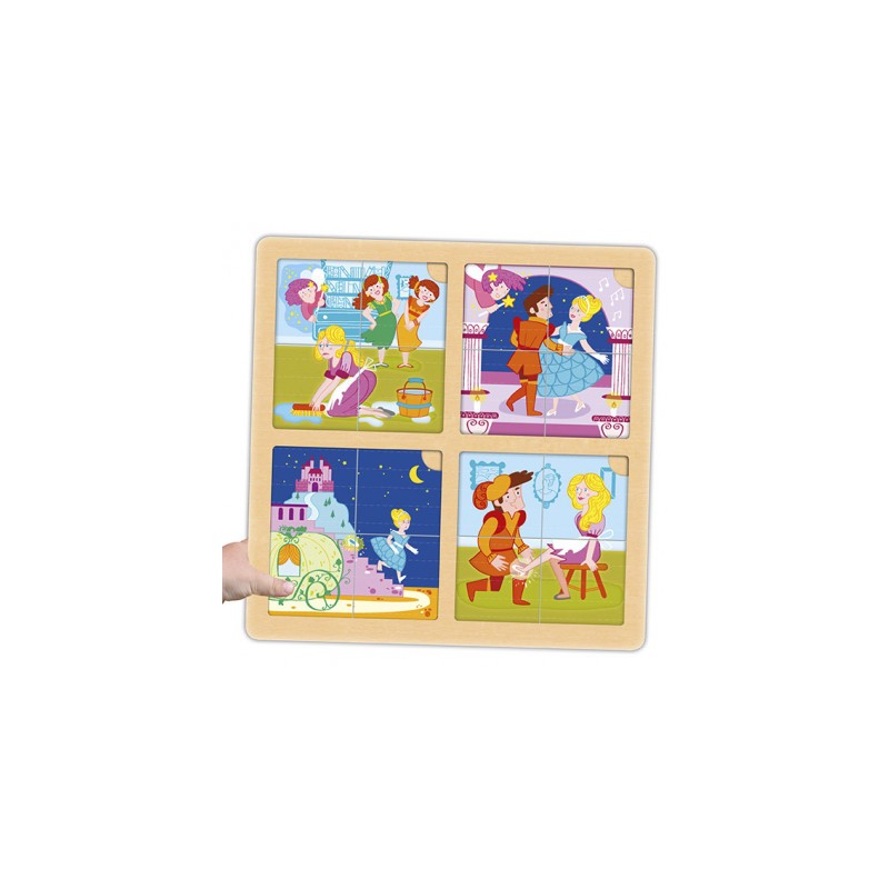 Cada conto é baseado em uma base de madeira que inclui quatro Puzzles com ilustrações