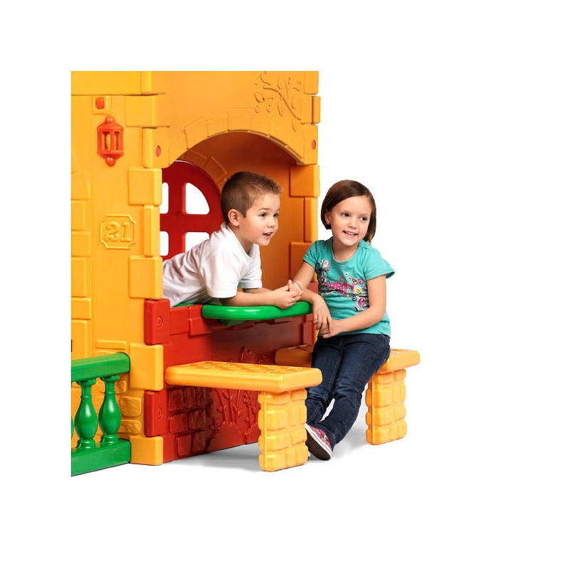 Esta casinha está repleta de detalhes, como uma porta com caixinha de correios para as cartas, janelas que podem se abrir e fechar e bandeja de jogos e dois banquinhos fixos para se sentar.
