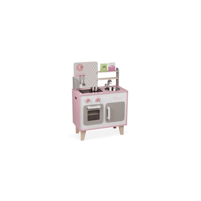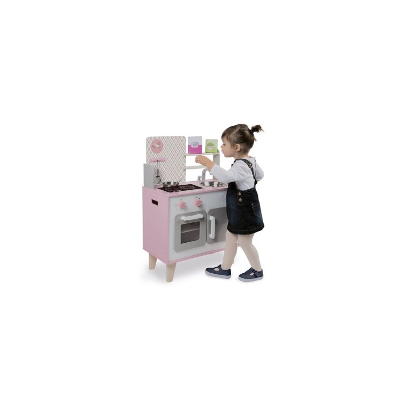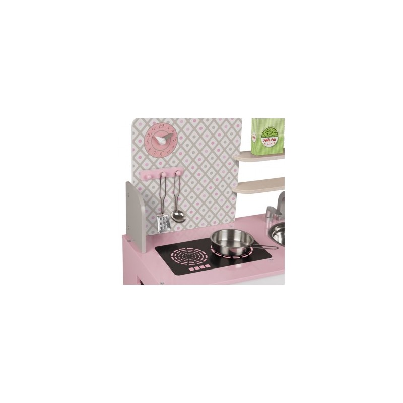 Doce como um macaron, assim é esta cozinha de madeira com relógio, suporte para pendurar colheres, pia metálica e dois botões giratórios do forno. Além disso, inclui cinco utensílios e acessórios para poder cozinhar deliciosos pratos.