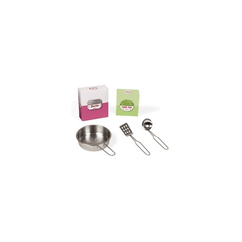 . Inclui 5 acessórios: 2 colehres de metal, 1 frigideira de metal e 2 caixas de alimentos de cartão.