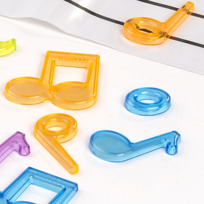 Um conjunto de contadores translúcidos em várias cores em forma de notas musicais.