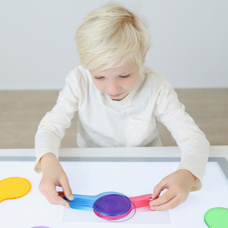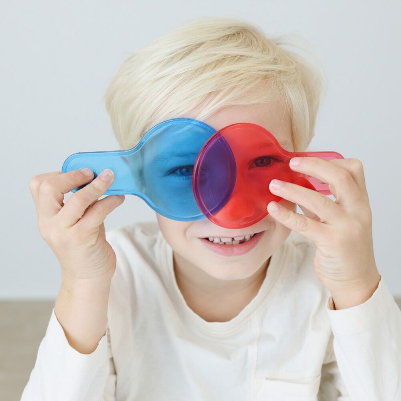 Jogo de paletas translúcidas de cores diferentes que permitem que meninos
