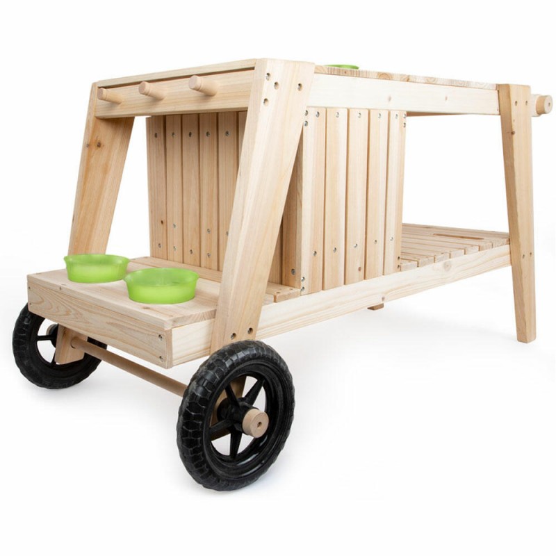 Esta cozinha convida as crianças a fazer lama nos tempos livres. Uma atração especial é o forno! Possui duas calhas pré-montadas para inserção do “tabuleiro”. A porta do forno pode ser aberta completamente. Um fecho magnético garante que a porta feche com segurança. Os dois vasos não só podem ser usados para barro, mas também podem ser plantados com flores, ervas e muito mais; ou servir como recipientes de coleta. As duas panelas na parte superior também podem ser utilizadas para organizar outros ingredientes. Ferramentas de jardim longas podem ser armazenadas com segurança em dois níveis com a ajuda de orifícios ranhurados. Para uma utilização duradoura, a madeira não tratada pode ser colorida com um verniz protetor para madeira de acordo com as suas necessidades.