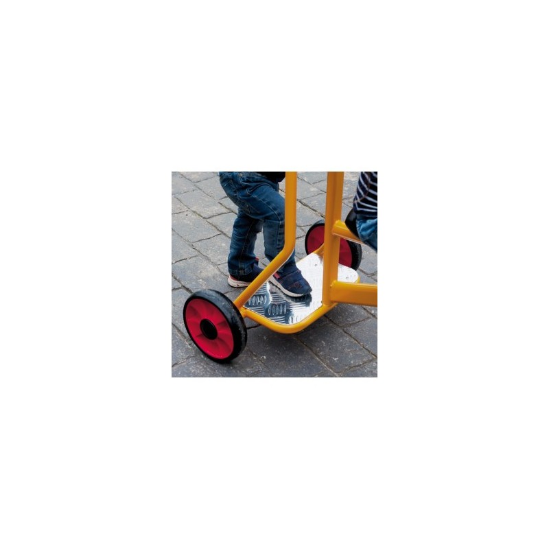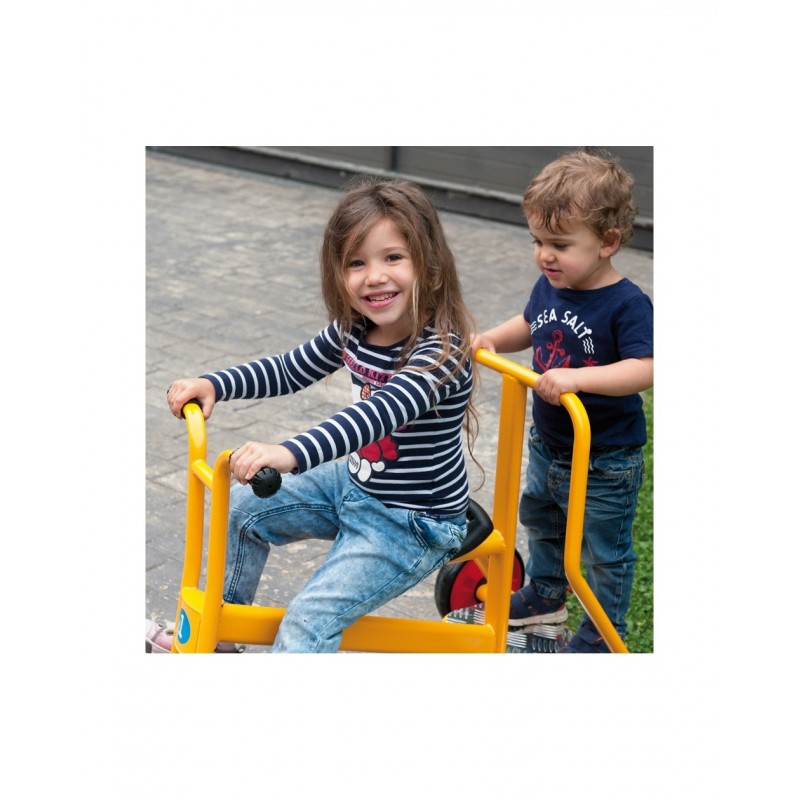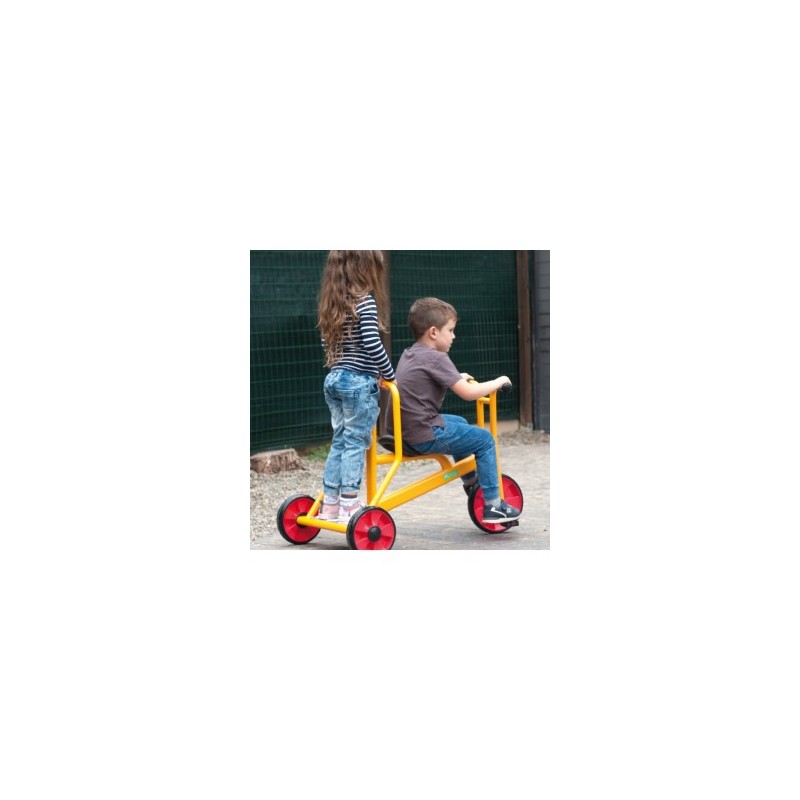 Este forte triciclo permite muita diversão para mais de uma criança ao mesmo tempo. Equipado com uma barra de segurança e apoio para os pés antiderrapante. O selim pode ser ajustado em 2 posições. Punhos de guidão de borracha sólida.