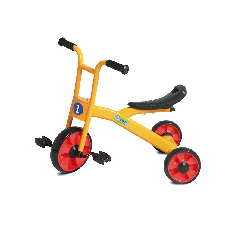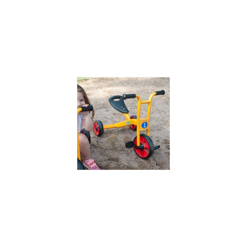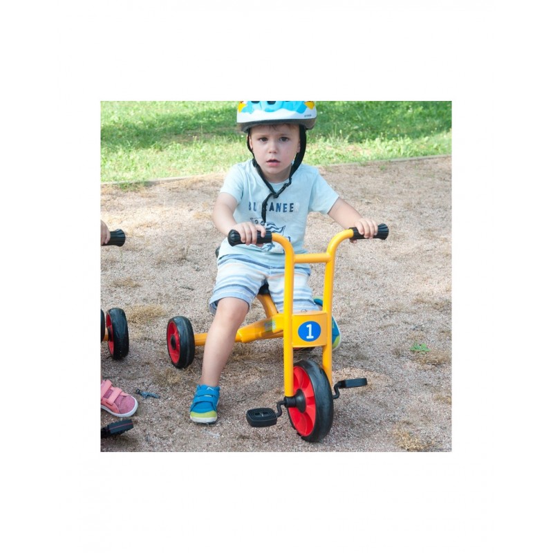 Triciclo muito resistente especialmente concebido para utilização intensiva. Atende às normas CE EN71. Fácil de montar e com assento com 2 posições.